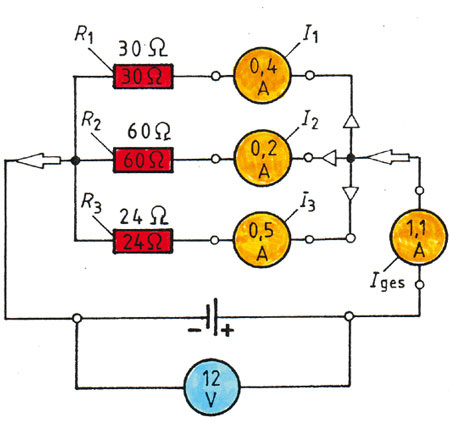 Die zweite Grundschaltung ist die Parallelschaltung. Wenn in der Christbaumbeleuchtung als typischer Reihenschaltung ein Lämpchen durchbrennt, fällt gleich die ganze Lichterkette aus. Diesen Nachteil vermeidet die Parallelschaltung. Sie ermöglicht es, einzelne elektrische Betriebsmittel unabhängig von einander zu betreiben. Darum ist sie auch in der Praxis weit häufiger als die Reihenschaltung. Die elektrischen Verbraucher im Haushalt, wie Fernseher, Beleuchtung, Ölbrenner usw., sind alle parallel zueinander angeschlossen. Alle Stromversorgungsnetze sind nach dem Prinzip der Parallelschaltung aufgebaut. Bei der Parallelschaltung liegt an allen elektrischen Verbrauchern die gleiche Spannung an. Durch jeden Verbraucher fließt ein Strom, der seinem Widerstand entspricht. An den Verzweigungspunkten addieren sich die einzelnen Ströme zu einem Gesamtstrom bei gleich bleibender Spannung.