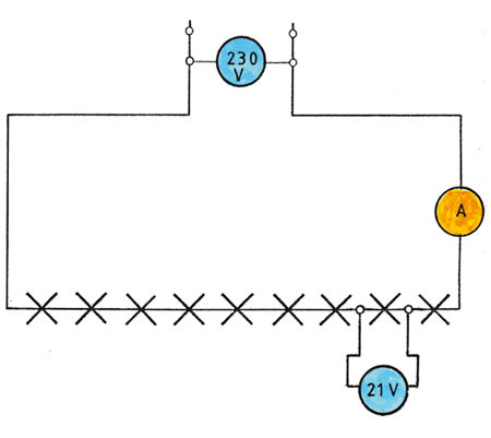 Um die Zahl der einzelnen Zellen zu erhalten, muss man nur die Gesamtspannung durch 2 V teilen. Umgekehrt erhält man die Spannung einer Zelle, indem man die Gesamtspannung durch die Zahl der Zellen teilt. Das Paradebeispiel für eine Reihenschaltung von Verbrauchern ist die elektrische Christbaumbeleuchtung. Die Gesamtspannung geteilt durch die Zahl der Lämpchen ergibt die Spannung eines einzelnen. Bei elf Lämpchen beträgt die Spannung also (230 V : 11 = 20,91 V) rund 21 V. Auch hier ergibt die Summe der Einzelspannungen die Gesamtspannung. Während sich beim Akku die Einzelspannungen addieren, werden sie bei einer Reihenschaltung von elektrischen Verbrauchern von der Gesamtspannung abgezogen. Liegt am ersten Lämpchen der Christbaumbeleuchtung noch die volle Spannung von 230 V an, so sind es am zweiten nur noch 209,09 V. Hinter jedem Lämpchen vermindert sich die Spannung um 20,91 V. In der Reihenfolge geht es weiter bis zur letzten Lampe.