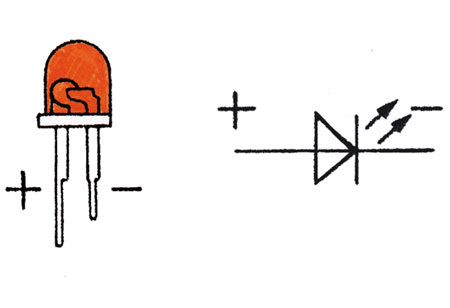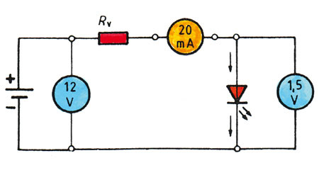 Heute werden anstelle von Lampen sehr häufig LEDs eingebaut. Die Abkürzung LED stammt vom englischen „light emitting diode“. Gegenüber Glühlampen sind sie kleiner, erschütterungsfester, haben eine höhere Lebensdauer und – eine geringere Stromaufnahme. Sie arbeiten also mit geringeren Spannungen als herkömmliche Lampen. Noch etwas muss man beim Einsatz von LEDs wissen: Als Halbleiterelement kommt es bei ihnen auf die richtige Polung an. Bei vertauschter Polung wirkt die Leuchtdiode wie ein abgesperrtes Ventil. Sie ist dann stromundurchlässig und leuchtet nicht. Die angelegte Spannung wirkt als Sperrspannung. In den Katalogblättern der Hersteller steht neben der Durchlassspannung (Betriebsspannung) noch die Sperrspannung. Eine zu hohe Sperrspannung zerstört die Diode. Soll nun eine Leuchtdiode mit einer Durchlassspannung von 1,5 V und einem Strom von 20 mA an die Kfz-Batterie von 12 V angeschlossen werden, so ist ein entsprechender Vorwiderstand nötig. Seine Aufgabe ist es, 10,5 V überschüssiger Spannung zu vernichten: