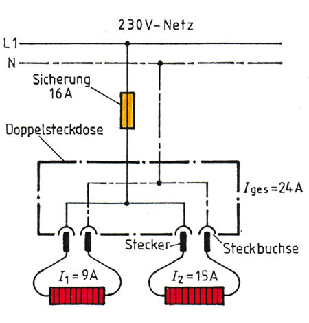 Der Gesamtwiderstand einer Parallelschaltung ist immer kleiner als der kleinste Einzelwiderstand. Jeder parallel geschaltete Widerstand bedeutet zusätzlichen Leiterquerschnitt, durch den Strom fließen kann. Je mehr Widerstände in einer Parallelschaltung vorhanden sind, desto kleiner wird der Gesamtwiderstand, und desto größer wird der Strom, der fließen kann. In der Praxis bedeutet das, dass man beliebig viele Verbraucher an eine Parallelschaltung anschließen kann – vorausgesetzt, die Spannungsquelle macht nicht schlapp. Sind zum Beispiel ein Heizlüfter mit einer Stromstärke von 9 A und eine Waschmaschine, die dem Netz bei vollen Touren 15 A entnimmt angeschlossen, fließt bei gleichzeitigem Betrieb beider Geräte ein Gesamtstrom von: