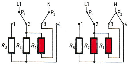 Die Heizleistung ist meist in sechs Stufen unterteilt, wie aus den Ziffern am Drehknopf des Schalters hervorgeht. In ebenso viele Einzelwiderstände ist der gesamte Widerstandsheizkörper unterteilt. Mit jeder höheren Schaltstufe wird ein weiterer Heizwiderstand dazugeschaltet.