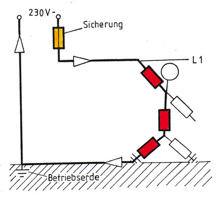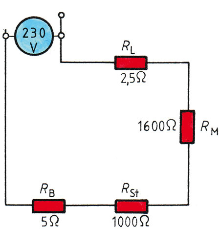 Der Widerstand des menschlichen Körpers RM beträgt im Durchschnitt 1600 Ohm. Ebenso wichtig ist der Widerstand des Standorts RSt. Der ist abhängig Materialeigenschaften wie den Schuhen (trockene oder feuchte Sohle oder barfuß) und der Leitfähigkeit des Bodens (Estrich, Parkett, trockene oder feuchte Erde). Wenn man für den Standortwiderstand 1000 Ohm in die Rechnung einsetzt, liegt man sicher nicht daneben. Mit diesen Widerständen verglichen ist der Leitungswiderstand RL mit 2,5 Ohm und der Widerstand der Betriebserde RB mit 5 W fast vernachlässigbar. Um die Wirkung des Stroms auf das Unfallopfer beurteilen zu können, muss man die Stromstärke nach dem Ohmschen Gesetz berechnen: