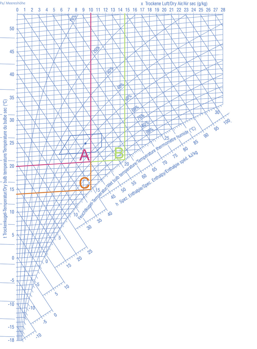 Auf den ersten Blick verwirrend, kann man nach kurzer Einführung in die Bedeutungen der Linien und Kurven das dahinterstehende Prinzip verstehen. Links auf der senkrechten Y-Achse ist die Temperatur aufgetragen. Die waagerechte X-Achse stellt die Zunahme an absoluter Feuchte dar.