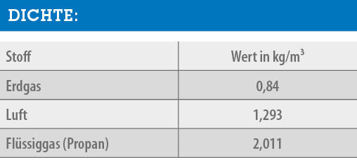 Im Dichtevergleich erkennt man gut: Erdgas steigt in der Umgebungsluft auf (weil leichter), während Flüssiggas zu Boden sinkt (weil schwerer). Einige Sicherheitsvorschriften im Umgang mit diesen, für den Anlagenmechaniker alltäglichen Gasen, berücksichtigen genau diesen Umstand.