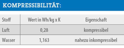 Luft ist sehr leicht komprimierbar. Wird der Raum für ein eingeschlossenes Luftvolumen z.B. halbiert, verdoppelt sich der Druck. Für Wasser gilt erfahrungsgemäß, dass es nicht komprimiert werden kann.