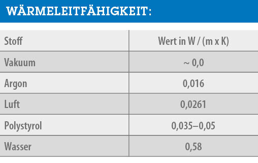 Für die Anlagentechnik ist es jedoch wichtig, dass durch eine Schicht aus Luft mehr Wärme transportiert wird als durch ein gleich dicke Schicht aus Argon. Argon ist ein Edelgas mit, wie der Name schon vermuten lässt, sehr zurückhaltendem und daher edlem Verhalten. Zunutze machen sich diese, gegenüber Luft bessere Isolierwirkung, die Hersteller von hochwertigen Isolierglasen. Drückt man nämlich Argon zwischen zwei Scheiben, werden die Wärmeverluste eines solchen Fensters gegenüber einer Füllung nur mit Luft insgesamt reduziert. Ein Vakuum ließe sich dauerhaft in diesen Zwischenraum zwischen zwei Scheiben viel schlechter ziehen, obwohl der Zahlenwert für die Isolierwirkung noch bessere Werte erwarten lässt.