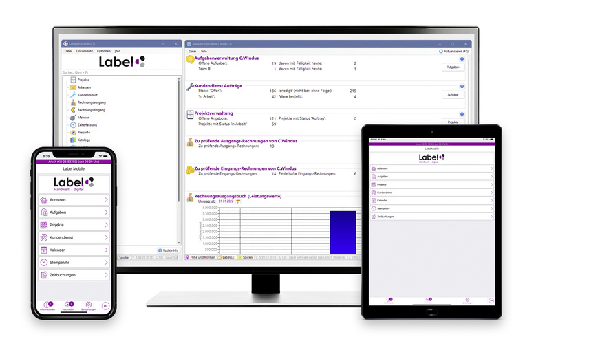 Für René und Andre Schmitt stand von Anfang an fest, dass sie ihren Betrieb nur mit digitaler Unterstützung führen wollen. „Bei einer Neugründung sollte man direkt auf eine geeignete Handwerkersoftware setzen, damit sich erst gar nicht analoge Prozesse einschleichen können. Für mich gehört die digitale Prozessabwicklung in einem Handwerksbetrieb zum Pflichtprogramm.“ sagt René Schmitt. In dem noch jungen SHK-Betrieb werden bereits jetzt sämtliche Geschäftsvorgänge in der Bürosoftware Labelwin und der dazugehörigen App Label Mobile verwaltet und dokumentiert. „Durch den lückenlosen Informationsfluss fühlt sich der Kunde bei uns gut aufgehoben, weil er weiß ‚Ok, die wissen immer über alles direkt Bescheid wenn ich anrufe, die kümmern sich‘. Da muss niemand erst am Telefon sagen, dass er die Rechnung erst raussuchen und sich noch einmal melden muss. Ich gebe den Kundennamen ins System ein und habe alle Informationen zu dem Kunden oder Vorgang direkt vor mir und kann Kundenfragen sofort beantworten. Das gehört für mich zu einem guten Kundenservice dazu.“