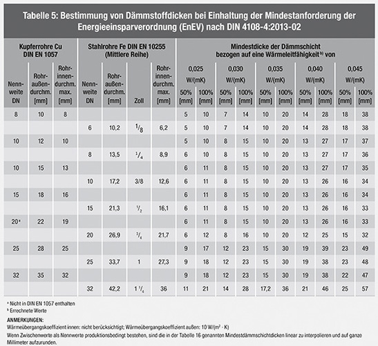 Die korrekten Dämmschichtdicken für abweichende Werte der Wärmeleitfähigkeit lassen sich auf der Grundlage der VDI 2055, Blatt 1 errechnen. Einfacher ist es allerdings die geforderten Dämmschichtdicken für Stahl- und Kupferrohre direkt aus den Tabellen 15 und 16 der DIN 4108-4:2013-02 zu entnehmen. Eine zusammenfassende Darstellung bietet die Tabelle 5.