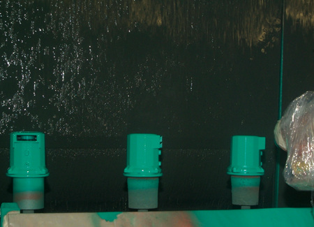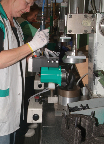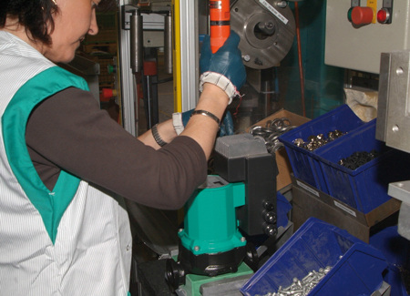 Zuvor muss aber noch der bewegliche Teil des Motors, der Rotor hergestellt werden. Den größten Teil dieser Aufgabe erledigt eine Maschine. Sie presst das Blechpaket auf eine Welle aus Edelstahl und überdreht den Außendurchmesser des Rotors (Bild 8). Auf jeder Welle wird per Hand ein Sprengring aufgebracht, der das Axialspiel des Rotors begrenzt. Auf einer weiteren Station folgt schließlich das Wuchten des Rotors, das wiederum der Laufruhe der Pumpe dient und sie vor vorzeitigem Verschleiß schützt (Bild 9). Zu jedem Elektromotor gehört auch ein Motorgehäuse, das die einzelnen Bauteile des Motors aufnimmt. Vor der Montage erhält es in der automatischen Lackierstraße die Wilo-typische grüne Farbe. Dazu werden die Gehäuse auf drehbaren Tellern platziert und an einer Lackiervorrichtung vorbeigeführt (Bild 10).