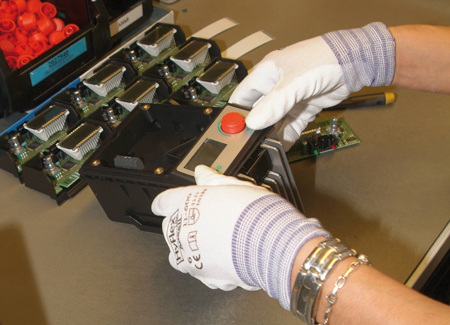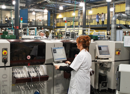 In einer klimatisierten Fertigungshalle werden in Dortmund sämtliche Elektronikkomponenten für alle Wilo-Pumpenwerke weltweit hergestellt. Die Kapazitäten der Elektronikfertigung wurden mit einer neuen SMT-Anlage (surface-mounting-technology, zu Deutsch: automatische Bestückung von mikroelektronischen Bauteilen) deutlich ausgeweitet. Damit können bis zu 30000 Elektronikteile pro Stunde bestückt werden, mit denen die Elektronikmodule der elektronisch geregelten Wilo-Pumpen ausgestattet werden (Bild 11). Auf den Platinen, die in die Elektronikmodule der Wilo-TOP-E-Pumpen eingebaut werden, befinden sich auch größere Teile wie zum Beispiel die Anschlussklemme für 230V-Spannung. Das bedeutet, dass nicht alle Bauteile über die neue SMT-Anlage auf die Platine gelangen. Stattdessen wird ein geringer Teil per Hand nachbestückt und separat verlötet. Danach wird die fertige Platine in den Grundkörper des Elektronikgehäuses platziert und verschraubt (Bild 12). Nun folgt im zweiten Gehäuseteil die Montage des Displays und des bei den Wilo-Pumpen charakteristischen roten Knopfs. Mit ihm kann der Installateur die Pumpe später „mit einem Dreh“ anlagenspezifisch einstellen. Damit das auch funktioniert, müssen nun die beiden Gehäuseteile ineinander gesteckt und verrastet werden. Damit ist die Regelungselektronik fertig gestellt und kann einer abschließenden Funktions- und Sicherheitsprüfung unterzogen werden (Bild 13).