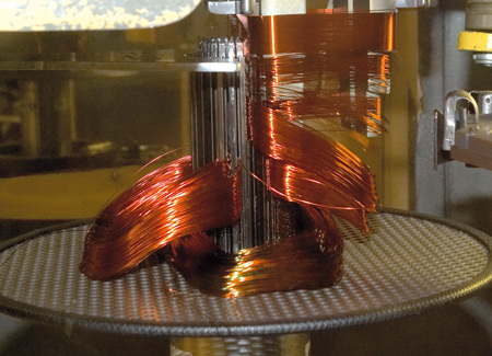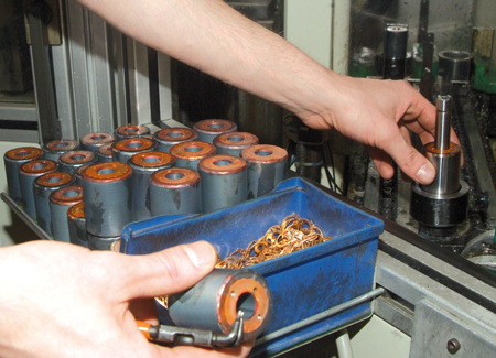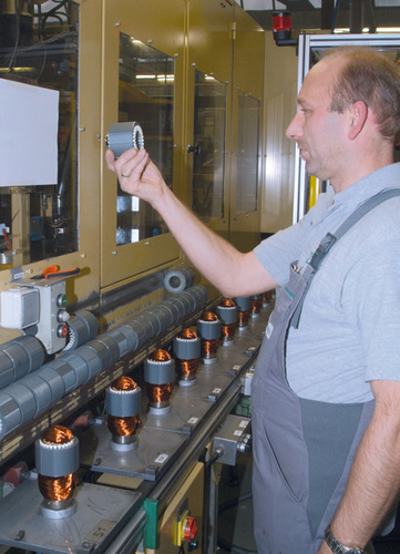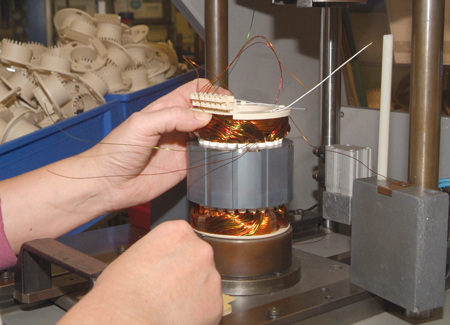 Da jede Umwälzpumpe von einem Elektromotor angetrieben wird, befindet sich im Wilo-Hauptsitz in Dortmund auch eine eigene Motorenfertigung. Dort werden zuerst die Statoren, so bezeichnet man den feststehenden Teil eines Elektromotors, hergestellt. Dazu werden die zuvor gefertigten und mit Isolierstreifen versehenen Blechpakete nach einer kurzen Sichtkontrolle in eine Maschine eingelegt (Bild 5). Die Wicklungspakete werden vollautomatisch aus Kupferdraht hergestellt und anschließend in die dafür vorgesehenen Nuten im Blechpaket eingezogen (Bild 6). Bei den nächsten Arbeitsschritten ist Handarbeit gefordert: Zuerst wird der außerhalb des Blechpakets liegende Teil der Wicklungspakete in Form gebracht und die so genannte Wickelkopfkappe montiert. Zum Schluss dieses Arbeitsvorgangs werden die einzelnen Kupferlitzen in der Steckerleiste kontaktiert. Später wird von dort die Verbindung zur Regelungselektronik hergestellt (Bild 7).