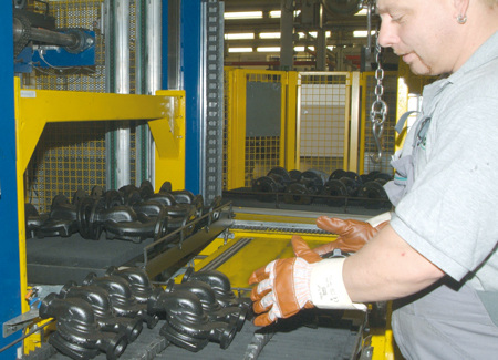 Am Anfang einer neuen Pumpenbaureihe steht die Idee. Diese wird dann von den Konstrukteuren bis ins kleinste Detail umgesetzt und zur Serienreife gebracht (Bild 2). Aber auch während der Serienproduktion werden durch den bei Wilo praktizierten kontinuierlichen Verbesserungsprozess ständig Optimierungen vorgenommen, um die Qualität und die Zuverlässigkeit der Produkte weiter zu steigern. Das Pumpenleben beginnt mit der Bearbeitung des Pumpengehäuses. Es besteht aus Guss und wird unbearbeitet von einer Gießerei angeliefert. In einer speziellen Maschine werden alle Anschlussmaße des Pumpengehäuses bearbeitet. Hierzu durchläuft es innerhalb der Maschine mehrere Stationen. Dabei werden von verschiedenen Werkzeugen unter anderem Bohrungen vorgenommen, Gewinde geschnitten und die Motoranschlüsse ausgedreht (Bild 3). Bei vielen der von Wilo gefertigten Pumpenserien sind die Pumpengehäuse serienmäßig mit einer Kataphoresebeschichtung versehen. Sie schützt das Pumpengehäuse dauerhaft vor Korrosion und macht es resistent gegen jede Art von Kälte- und Wärmeträgermedien. Dazu durchlaufen die Werkstücke auf Paletten eine vollautomatische Anlage, in der die Beschichtung durch elektrische Tauchlackierung aufgetragen wird. Am Ende werden die Teile entnommen und dem weiteren Arbeitsprozess zugeführt (Bild 4).