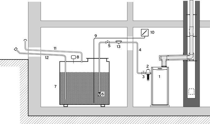 Legende 1 Ölbrenner 2 Ölfilter mit Heizölentlüfter 3 Absperrventil 4 Ölleitung (Einstrang) 5 Schnellschlusshahn 6 Saugventil 7 Öllagerbehälter 8 Grenzwertgeber 9 Messleitung 10 Ölstandsanzeiger 11 Entlüftungsleitung 12 Füllleitung 13 Membran-Antiheberventil