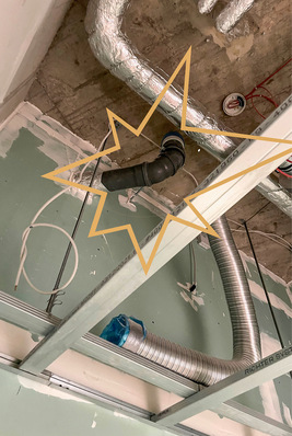 Man erkennt, dass diese Decke zum Schluss der Bauarbeiten abgehangen wird. Dann guckt da keiner mehr hin. Ganz oben unter der Decke befindet sich aber dann für die nächsten Jahre eine Belüftungsventil für das Abwassersystem. Nicht nur, dass das normativ an der Stelle nicht einzubauen ist, kann man...