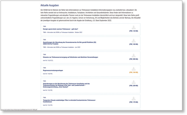 TWIN (TrinkWasserINstallation) vom DVGW (Deutscher Veband der Gas- und Wasserfachleute) hat auf seiner Internetpräsenz Informationen zur Trinkwasserhygiene zusammengestellt. Die sogenannten TWIN-Blätter ergänzen die normativen Regelungen.