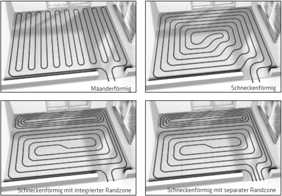 Als die gebräuchlichsten Verlegearten bei einer Fußbodenheizung werden mäanderförmige (schlängelnde) oder bifilare (schneckenförmige) Verlegungen bevorzugt eingesetzt.