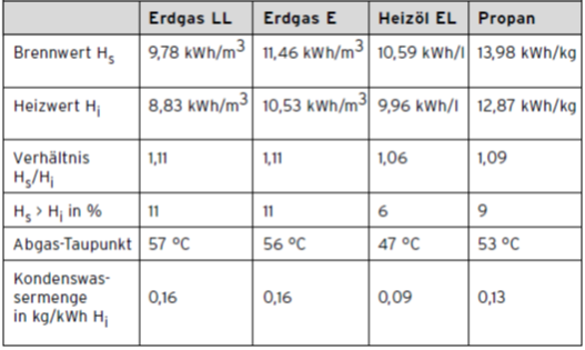 Je nach Brennstoff ist in den Heizgasen mehr oder weniger Wasser in Form von Dampf enthalten. Bei der Verbrennung von Erdgas entstehen bis zu 1,5 Liter Wasser in Dampfform pro Kubikmeter Erdgas, bei Heizöl sind es bis zu 0,9 Liter Wasser pro Liter Heizöl.