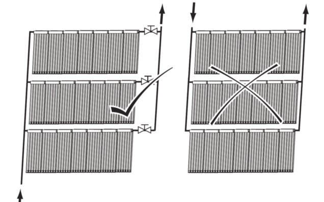 Die Anzahl der Kollektoren hat Einfluss auf den Volumenstrom des Kollektorfeldes. Je mehr Kollektoren durchströmt werden, desto größer muss der zirkulierende Gesamtvolumenstrom