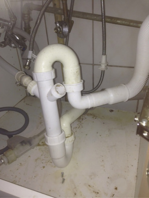 Hier haben unsere zukünftigen Akademiker aus dem Studentenwohnheim versucht eine Spüle und zwei Spülmaschinen selbst anzuschließen. Der Anruf bei uns im Betrieb lautete: „Unter der Spüle tropft es ein wenig.“