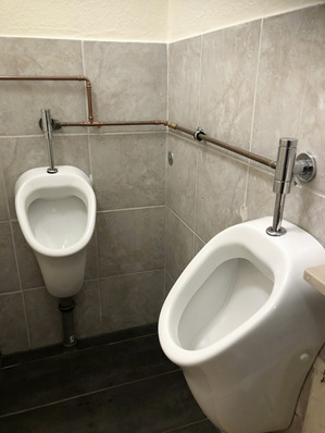 Hier wurde mittlerweile in einem dritten Anlauf die ursprüngliche Installation der Urinale verrohrt. In der Wand verzinkte Leitungen (Version 1), vor der Wand weich gelötet (Version 2) und später dann noch mit Pressverbindungen ergänzt (Version 3). Eine ganz besondere Art einer Mehrgenerationen-WC...