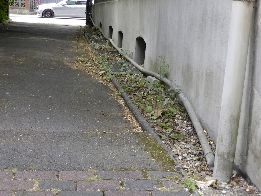 Die DIN 1986 und 12056 können umgeschrieben werden, denn es funktioniert! Man verjünge von 100 auf 50 und schlängele es über steinerne Stützen durchs Gelände. Danach sollte es einfach in den Boden abtauchen.