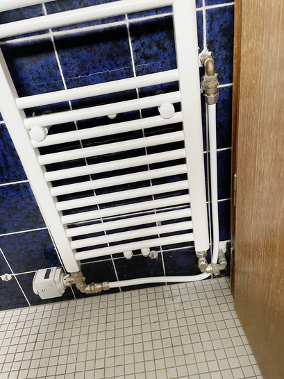 Dieser Handtuchkörper sollte wohl den alten und in die Jahre gekommenen Stahlkoloss ersetzen. Anschlüsse waren ja schon da und schwupp, war der Neue dran und warm. Man möge sich im Anschluss an diese Montageleistung mal Oma Müller vorstellen, die dieses Kunstwerk ihres Handwerkers der Nachbarin präsentiert. Folgeaufträge wird dieses Referenz-Objekt sicherlich nicht nach sich ziehen.