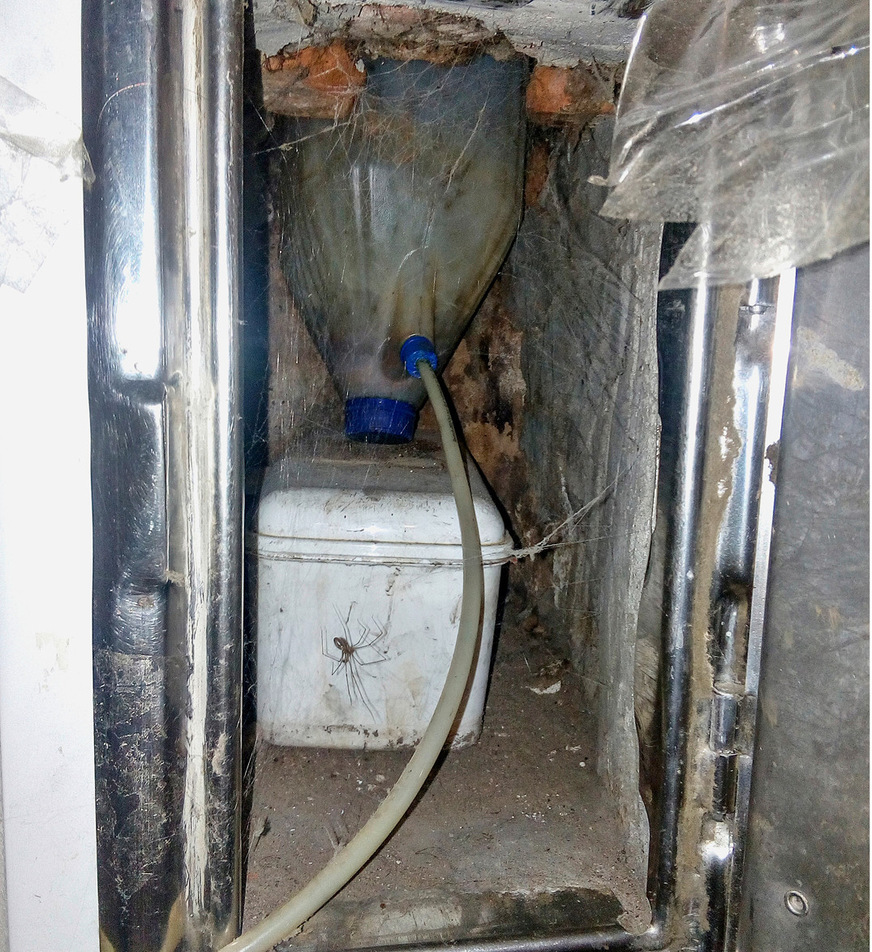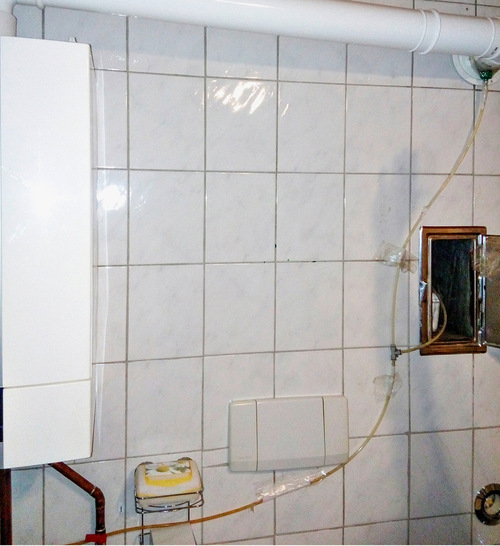 Auf den Bildern sieht man, wie die Brennwerttechnik eine ganz andere Bedeutung bekommt und sich jemand sehr viel Mühe gegeben hat das Kondensat im Abgasrohr abzuleiten. Wie man die Flasche in den Kaminschacht hineinbekommen hat, bleibt fraglich.