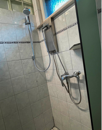 Auf dem Campingplatz ist diese Dusche mit Magnetventil im VA- Gehäuse montiert worden. Bei Einwurf von 50 Ct. gibt es eine gewisse Zeit warmes Duschwasser. Mit dieser Lösung kann man nach dem warmen Schwall mittels Zusatzhahn noch kaltes Wasser aus dem Brausekopf bekommen.