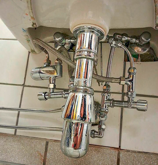 Es sollte nicht nur preiswert, sondern billig werden. Da ersann man wohl diese Konstruktion: Diese Anschlusstechnik ist seither in den Lehrbüchern unter „Chrom-Traum“ nachzuschlagen. Hier übrigens besonders ergänzt mit Stilelementen aus dem Lehrbuch zum Thema „Flexschlauch für Fortgeschrittene“.
