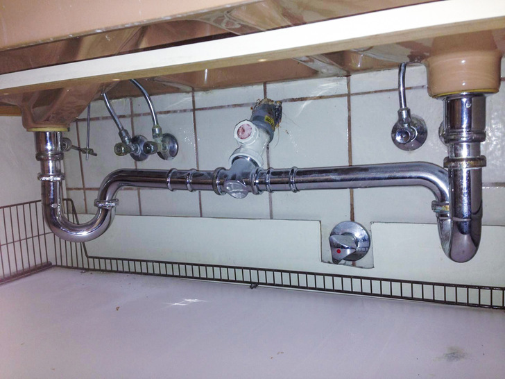 Bedenkt man, dass das Sperrwasser gewissermaßen seit der Inbetriebnahme vor 20 Jahren immer in dem Bereich sämtlicher, hier sichtbarer Abwasserleitungen steht, handelt es sich hier um eine außergewöhnliche Installation. Der Scheitelpunkt liegt fast auf der Höhe des Stopfenventils!