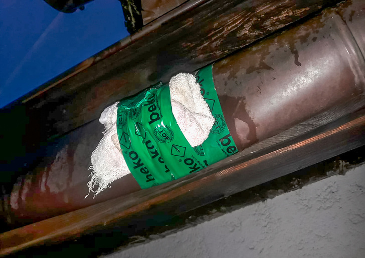 Kurzerhand wurde also ein „Druckverband“ angelegt. Am nächsten Tag kam dann gleich der Spengler und ersetzte das Rohrstück!