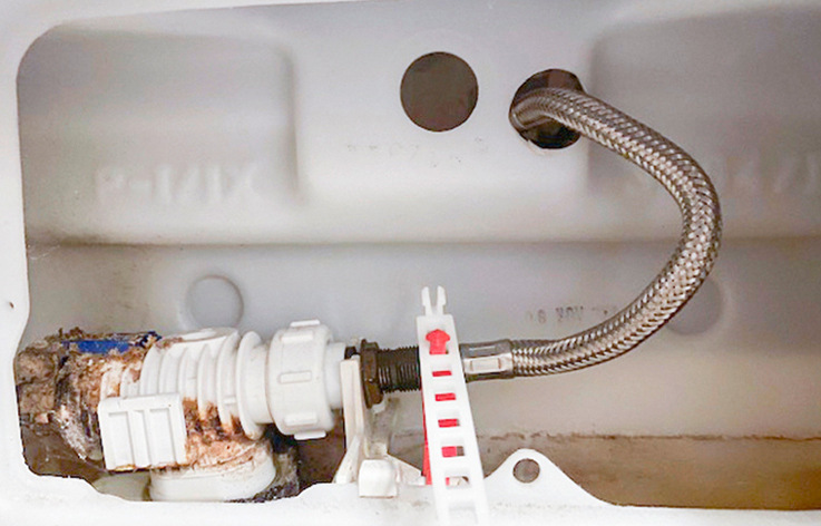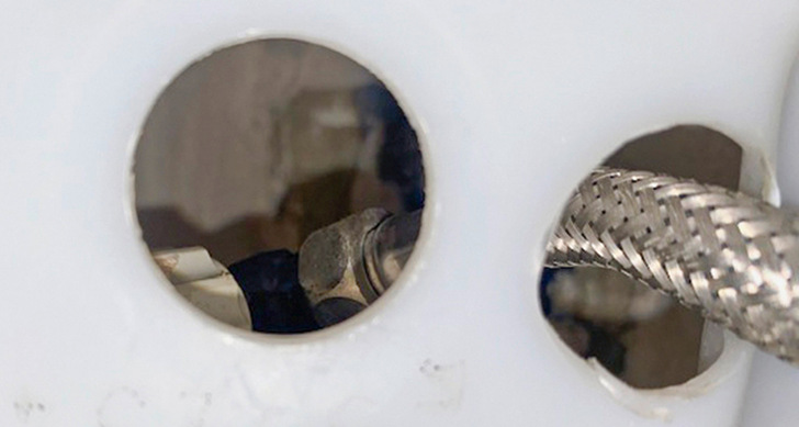 Und, was wird in Zukunft noch schwierig werden? Richtig, der Unterputzspülkasten verdeckte wohl den Trinkwasseranschluss. Anstatt diesen Anschluss anzupassen wurde kurzfristig und kurzsichtig ein weiteres Loch in den Spülkasten geschnitten. Für die Zukunft bleibt es schwierig das Eckventil zu schließen, geschweige denn zu tauschen. Irgendwie beknackt!