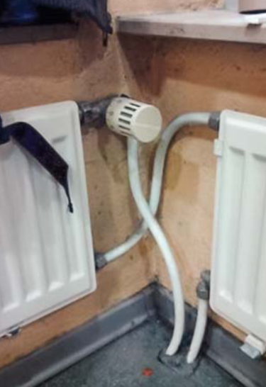 Wahrscheinlich, damit der zweite Heizkörper sich nicht so erschreckt wegen des heißen Vorlaufs, kriegt dieser das bereits abgekühlte Wasser vom ersten. Und man spart selbstverständlich ein weiteres Thermostatventil. Genial einfach und auch noch „très chic“ verlegt.