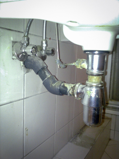 Damals, als die Schwerkraft auf der Erde noch nicht so ausgeprägt und lästig war, da lief auch dieser Waschtisch hervorragend ab. Mittlerweile setzt es sich durch, die Abwasserleitungen mit Gefälle in Fließrichtung zu verlegen. Ja, die gute alte Zeit, sie kehrt nimmer zurück.