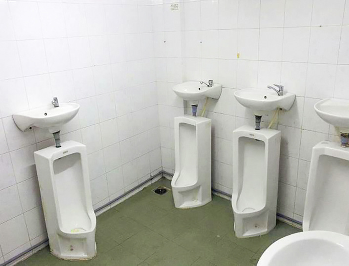 Diese Kombination zeigt doch jedem Nutzer was zu tun ist: Erst das kleine Geschäft erledigen und dann die Hände waschen. Dabei hilft das seifige Handwaschwasser beim Wegspülen des Urinsteins.