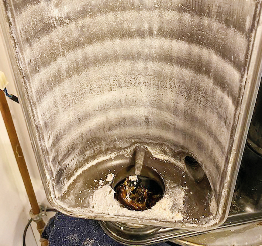 Ich habe die Heizung geöffnet und sah einen toten und bereits verwesenden Vogel in der Kondensatwanne liegen, der direkt über den Kondensatabfluss lag. Somit konnte das Kondensat nur noch bedingt abfließen.