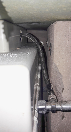 Vor und hinter der Wand wurde mit Panzerschlauch gearbeitet. Die Frage, die sich bei einer Reparatur stellt, ist die nach dem Austausch des Schlauchs hinter dem Spülkasten! Auch da will man ja die Quetschverschraubung lösen, um den Schlauch tauschen zu können.