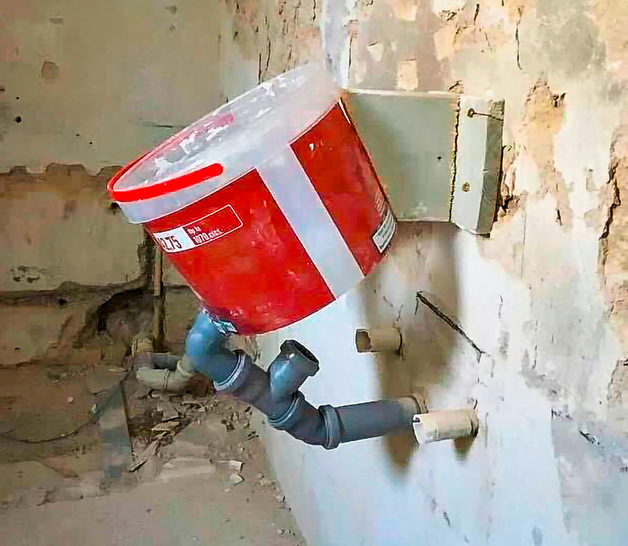 Wenn auf der Baustelle niemand ein Dixi-Klo aufstellen lässt, dann müssen findige Handwerker schnelle und kostengünstige Lösungen anbieten. Dieser Eimer wurde mittels HT-Bogen mit dem Abfluss verbunden und tat gute Dienste.