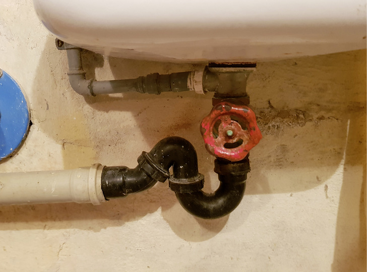 Dieser Waschtisch unterhalb der Rückstauebene hatte wohl schon mal bei einem Rückstau entsprechende Abwasser ins Haus strömen lassen. Ohne aufwendige Umbaumaßnahmen wurde daher ein „dicker“ Schieber eingebaut. Der Standard müsste nun sein, dass der Schieber geschlossen ist und nur während einer effektiven Nutzung geöffnet werden kann.