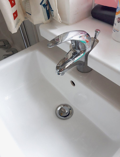 Wenn man mehrmals hinschaut, zweifelt man immer weniger an dem Sinn dieser Konstruktion. Die Bedienung der Armatur klappt. Stellflächen und Raum werden optimal genutzt. Utensilien befinden sich in Griffweite.