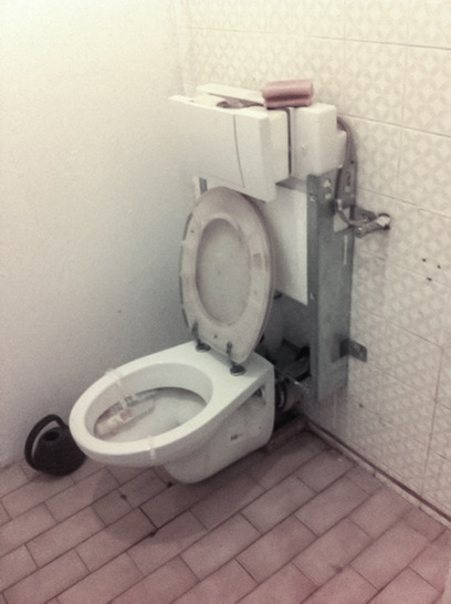 Nach „Naked Bikes“ als Trend für unverkleidete Straßenmotorräder folgt nun ein neuer Trend im Bereich der Sanitärausstattung. Zumindest in diesem WC will man den Blick auf die Technik nicht mit Fliesen versperren. Absolut stylisch und sicher ein Schritt in Richtung neuer Design-Welten.