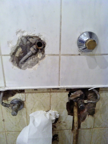 So richtig sehen konnte man diese abenteuerliche Installation in den ganzen Jahren nicht. Da hatte jemand zur Tarnung abschließend drüber gefliest. Aber bei der Sanierung der Installation ist es dann doch aufgefallen. Da fragt man sich wirklich: „Wer macht so etwas?“