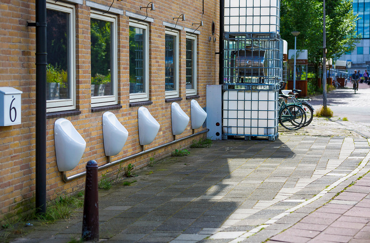 In den Niederlanden ist man offensichtlich nicht so eigen während seines kleinen Geschäfts. Das darf daher auch mal vor dem Wirtshaus, in Reihe und munterer Gesellschaft erledigt werden.
