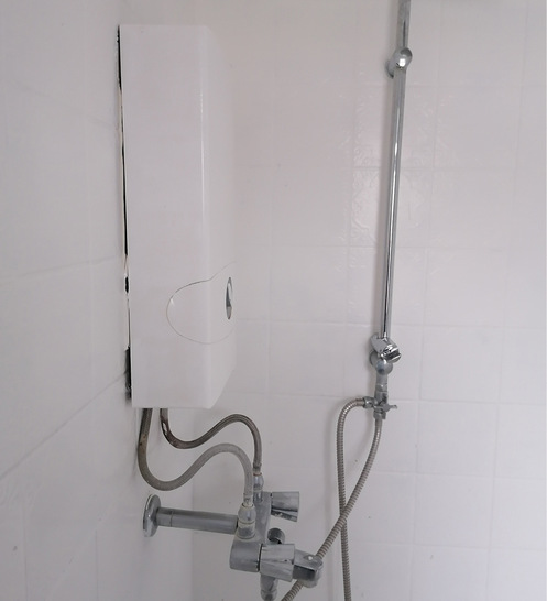 Auf diese Weise ließ sich der Durchlauferhitzer direkt in den Duschbereich integrieren. Schicke Panzerschläuche wurden schwungvoll in Richtung Armatur geflochten. Sieht mal wieder spitze aus und ist einer der Anwärter für den ersten Platz des ESC des Jahres 2024.