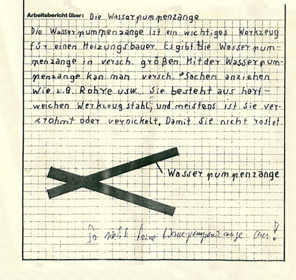 Alte Berichtshefte können uns heute Einsicht gewähren in die Weisheiten des letzten Jahrhunderts. Damals nahmen die Lehrlinge eine Wasserpumpenzange anscheinend noch als zwei aneinander genietete Metallstreifen wahr. Gut, dass der Kommentar des scharfsichtigen Meisters Klärung schaffen konnte: „So sieht keine Wasserpumpenzange aus!“