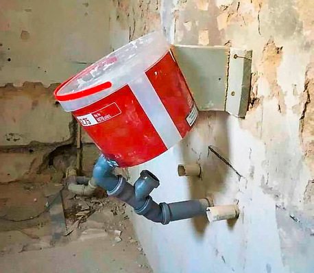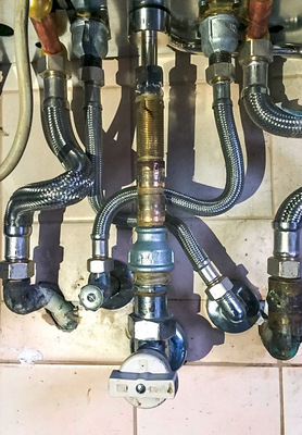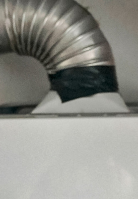 So viel Pfusch kann man nur auf mehreren Fotos erfassen. Die Totale (oben links) zeigt sehr schön und verstörend, wie man auch mit falschem Gefälle ein Abgassystem installieren kann. Der Zoom (oben rechts) weist auf den Versuch hin, das austretende Abgas mittels Klebeband neu zu dirigieren. Im Detail (rechts) sieht man dann noch, wie man auch beim Anschluss sämtlicher Verbindungsanschlüsse die allgemein anerkannten Regeln der Technik missachten kann.