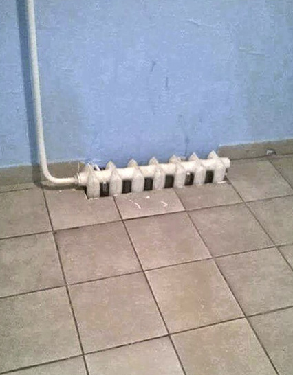 Hier kann man sich fragen, was zuerst da war. Wurde die Decke zuerst gegossen und dann der Heizkörper in unterschiedlichen Geschossen angeklemmt? Hat man nachträglich eine Decke eingezogen und den Heizkörper einfach für beide Geschosse beibehalten?