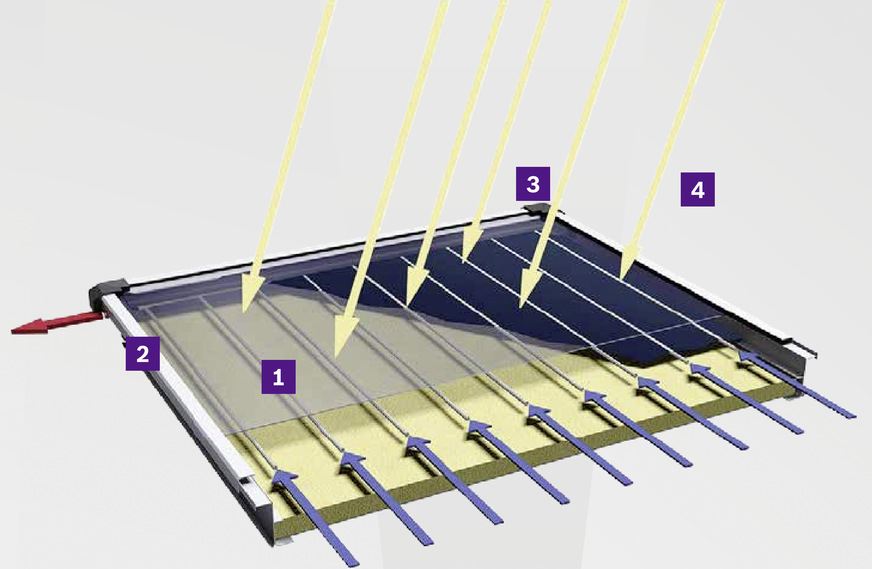 Flachkollektoren (FK) und Vakuumröhrenkollektoren (VRK) besitzen beide eine Absorberfläche (lateinisch absorptio = Aufsaugung). Hierauf vollzieht sich gewissermaßen die Umwandlung von Solarstrahlung, also dem Sonnenlicht, in Wärme. Der Absorber besteht meistens aus Metall und ist selektiv (lateinisch selectio = Auslese) beschichtet. Diese Schicht soll möglichst umfangreich die Wärmestrahlung sammeln und wenig Strahlungswärme abgeben. Dazu ist seit Entstehung thermischer Solaranlagen diese Beschichtung immer weiterentwickelt und verbessert worden. Reichte anfangs noch eine Schwärzung mit Ruß, kommen auf modernen Kollektoren schon sehr spezielle Überzüge zum Einsatz. Die umgewandelte Energie aus Strahlung wird dann als Wärme weitergeleitet. An dem Absorberblech sind dazu Rohre angebracht, in denen eine Flüssigkeit diese Wärme aufnimmt und dann den Abtransport zum Solarspeicher ermöglicht.
