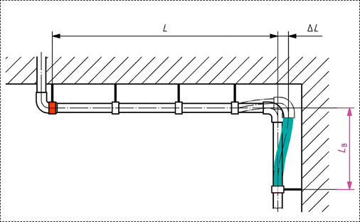 Die Länge des flexiblen Abzweigs sollte rechnerisch also mindestens 2020 mm betragen. Angesichts der Tatsache, dass sich das Kunstoffrohr gegenüber dem Kupfer um fast 12-mal stärker ausgedehnt hat, ist der freie Schenkel nur 1,5-mal so lang. Das Kunststoffrohr lässt sich nunmal mit geringerem Kraftauwand knicken als ein vergleichbares Kupferrohr.