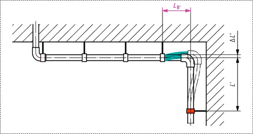 Bei Erwärmung wird also dieses Rohr unter der Decke den senkrechten Rohrschenkel am Ende der Rohrstrecke, also in der Skizze ganz rechts, verschieben. Das hier senkrecht eingezeichnete Rohr muss an irgendeiner Position auch wieder befestigt werden. Je weiter diese Befestigung nach oben rücken würde, desto weniger Spielraum wäre vorhanden für das großzügige Abknicken des Rohres. Die Länge LB in der zugehörigen Zeichnung kann also nicht beliebig klein gewählt werden. Und je nach Steifheit des Rohres kann diese Länge variieren.